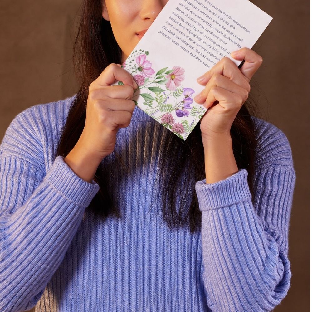 The flowers on the cover are hand painted (not AI) by an English artist based in Jane Austen's home county of Hampshire. Inside, painted flowers and foliage decorate the pages, and on the back you can find a quote about flowers from the novel.